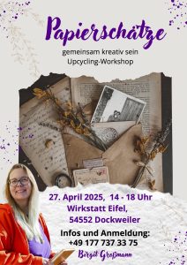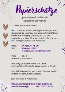 « Alle Veranstaltungen Diese Veranstaltung hat bereits stattgefunden. Papierschätze 27. April | 14:00 - 18:00 « Frauenzeit – aneinander teilhaben und wachsen Neumond – Meditation » Zum Kalender hinzufügen Google Kalender iCalendar Outlook 365 Outlook Live Details Datum: 27. April Zeit: 14:00 - 18:00 Veranstaltungskategorie: Sonstige Veranstaltung Veranstalter Birgit Großmann Telefon 0177 7373375 E-Mail mail@birgitgrossmann.de Veranstaltungsort Wirkstatt Dockweiler Hauptstr.27 Dockweiler, 54552 Deutschland Google Karte anzeigen Telefon 06595-1737