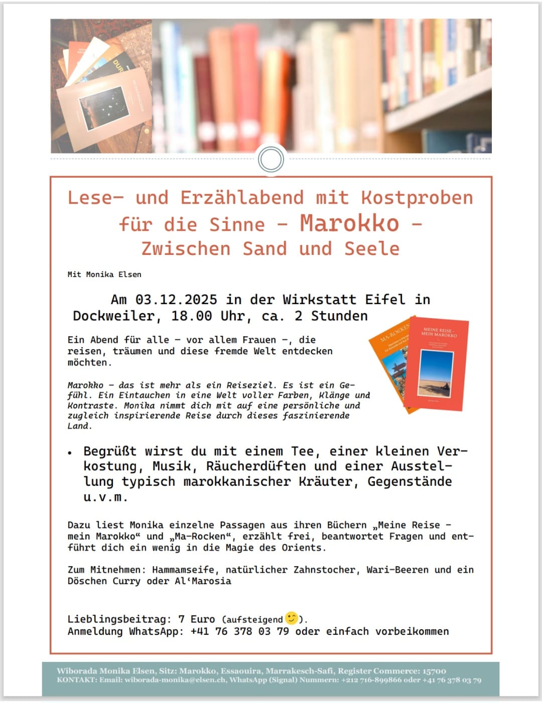 « Alle Veranstaltungen Diese Veranstaltung hat bereits stattgefunden. Sinnlicher Lese- und Erzählabend über Marokko 3. Dezember | 18:00 - 20:00 « MUSE – TAG Stille-Meditation am Abend » Zum Kalender hinzufügen Google Kalender iCalendar Outlook 365 Outlook Live Details Datum: 3. Dezember Zeit: 18:00 - 20:00 Veranstaltungskategorie: Sonstige Veranstaltung Veranstalter Monika Elsen Telefon +41 76 378 0379 Veranstaltungsort Wirkstatt Dockweiler Hauptstr.27 Dockweiler, 54552 Deutschland Google Karte anzeigen Telefon 06595-1737